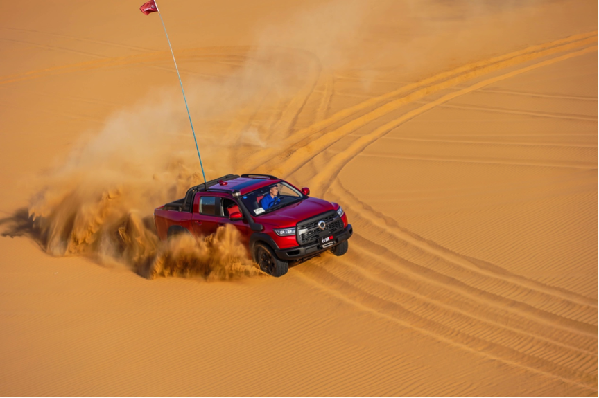 硬核的配置才是它的核心武器。长城炮越野皮卡标配前中后三把差速锁、坦克掉头、蠕行模式,使得整车脱困性能强悍。动力方面,本次发布的长城炮越野皮卡搭载2.0T汽油国六发动机,匹配来自采埃孚的8速手自一体变速器,并提供7种全地形驾驶模式,在蠕形模式、三把锁等功能的帮助下,让该车不仅能从容应对各种陡坡、恶劣的砂石路,在阿拉善的沙漠中“刷锅冲沙”更是游刃有余。值得一提的是,此次发布的长城炮越野皮卡采用了和乘用皮卡相同的多连杆后悬架,驾乘舒适性与传统皮卡相比大大提高。