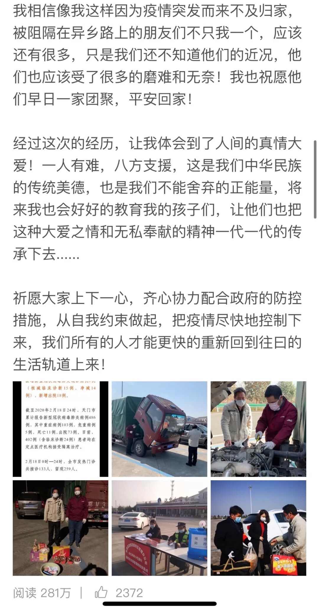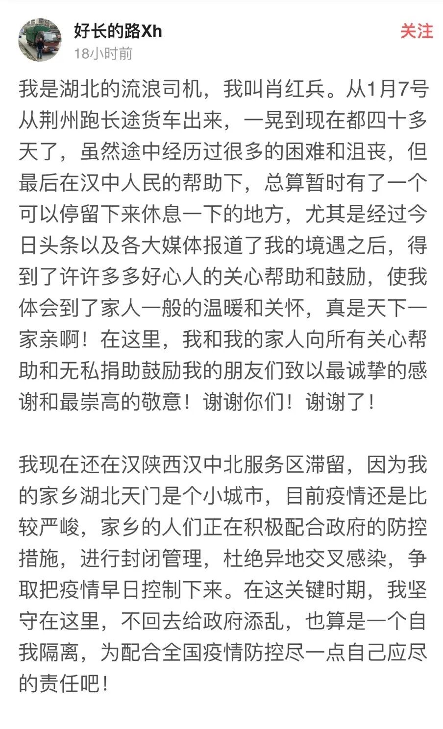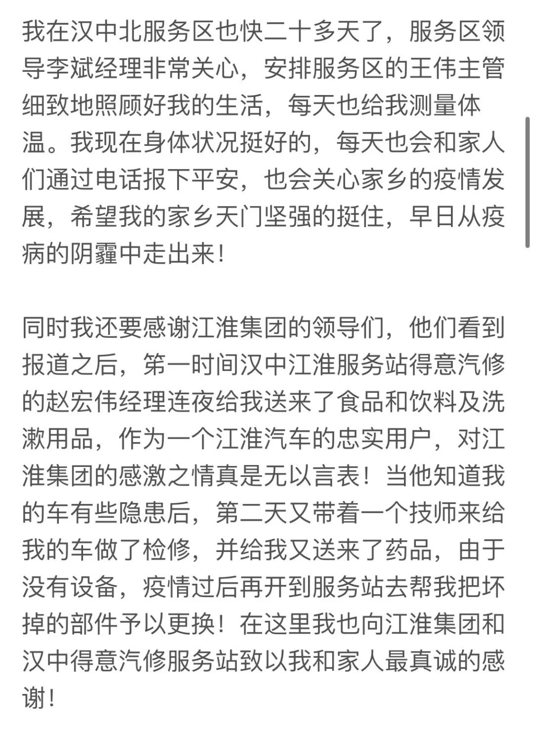 新冠病毒肺炎的爆发极大地影响了全国各地的交通出行,全国多地陆续执行封城、封路,湖北地区的高速也全面封锁。湖北的货车司机肖红兵自1月7日外出跑车后,因为疫情封路,被困高速长达数十天。肖师傅这一路经历坎坷,除夕和大年初一都在路上度过,期间还经历了被群众举报、被交警劝返等遭遇,被困高速,休息、吃住都成了问题,直至汉中高速交警把他带回了汉中北服务区落脚。 肖师傅的事情经过媒体报道后,引起了多方关注,江淮轻卡立刻安排当地工作人员,在第一时间为肖师傅送上了慰问和帮助。以下是肖师傅接受各方帮助后,在网络上发布自己的近况以及暖心感谢。 在疫情形势严峻时期,宅在家里、配合政府做好防控工作是最好的选择。但仍有人不辞辛劳的坚守在工作岗位上,其中就包括为抗击疫情运输驰援物资的卡哥们。 他们肩负着维系生命线正常运转的职责,防疫医疗物资、居民生活物资能够正常供给,离不开他们的付出。江淮轻卡用行动向逆行者致敬,与各位物流人一同坚守,你们在前方运输物资,我们做好后勤保障工作。江淮轻卡用行动将“五星服务,全程呵护”的服务理念贯彻到实处,1300家服务站遍布全国,让你无论身处何处,都能享受到及时的后勤保障服务。 为更好地打好疫情防控战,江淮轻卡启动服务战“疫”,2020年3月31日前,为疫情服务的所有江淮轻卡、皮卡用户享受全程免费维修服务;为疫情服务的所有品牌轻卡用户享受7*24小时免费外出救援及预约上门维保服务;所有疫情期间质保到期的江淮轻卡、皮卡用户可享受6个月延后维保服务。江淮轻卡与卡友们共抗疫情,为爱燃擎!