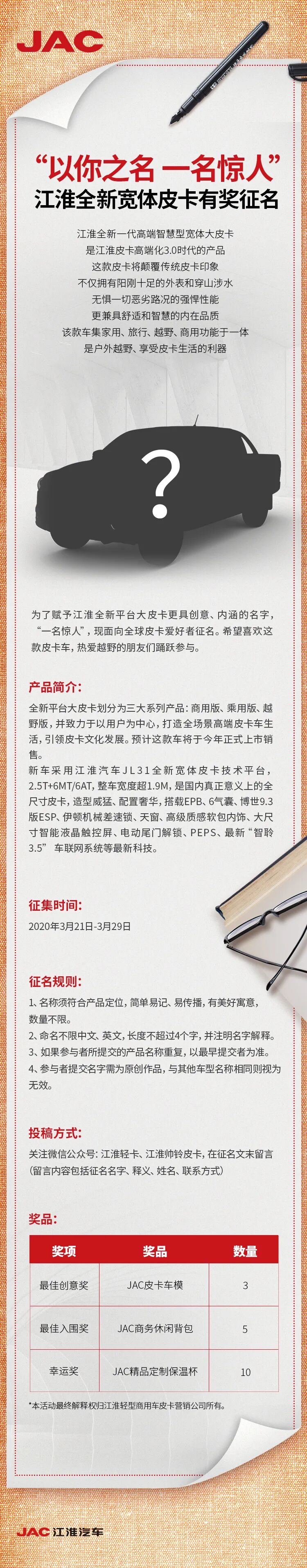 有奖征名丨“以你之名 一名惊人”,江淮全新宽体皮卡征名活动开启!
