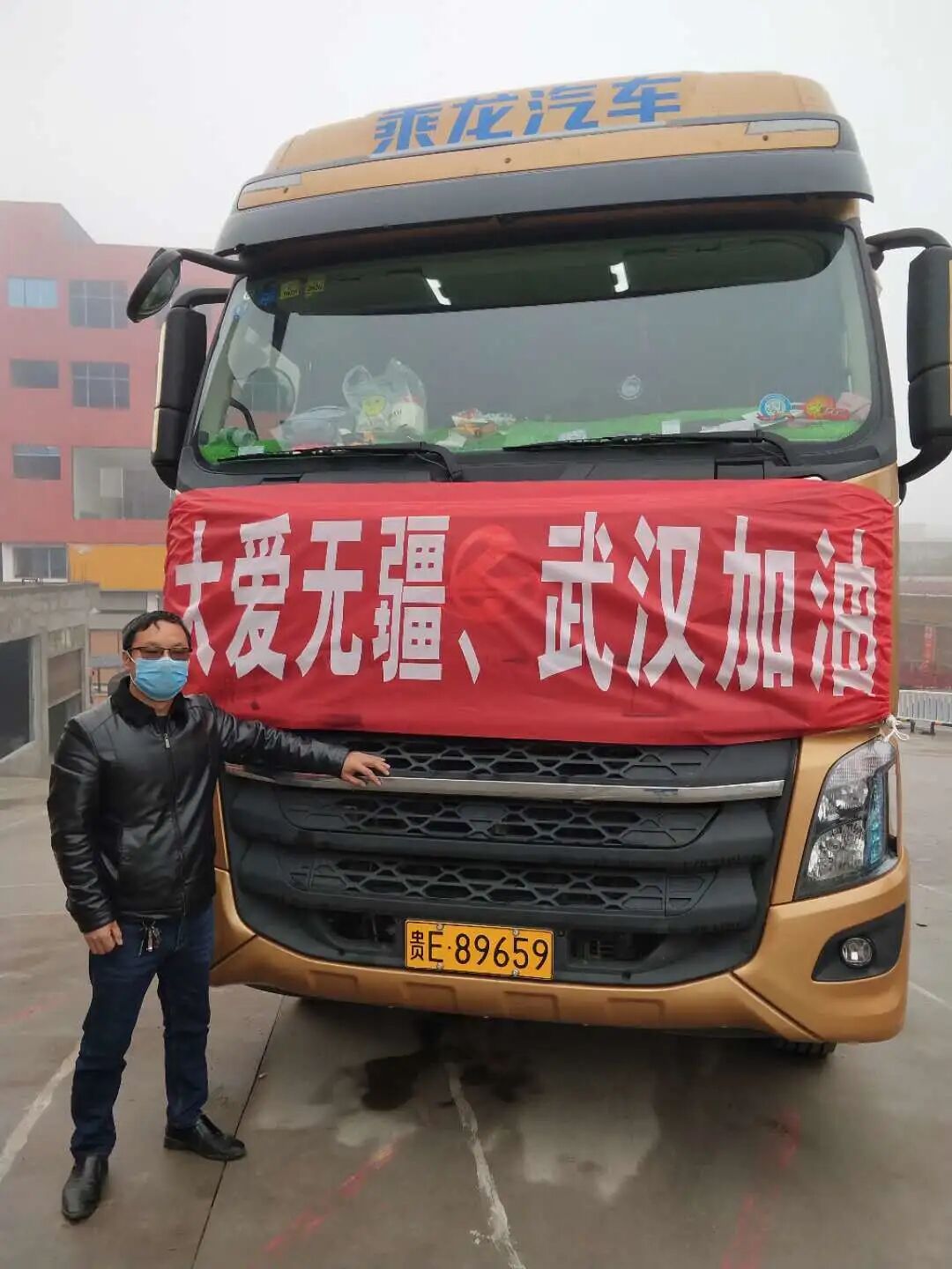 2月23日,覃继松满怀热血报名驰援湖北,和4名卡友从广西柳州运送10万斤柳州砂糖橘,10万袋柳州螺蛳粉,以及10万个柳州产防护口罩等物资到湖北十堰。