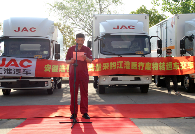 随后,安徽浩悦环境科技有限责任公司副总经理高巍进行了发言。他表示,疫情给全社会带来了极大考验,特别是医疗废物激增,带来前所未有的转运挑战。江淮轻卡发挥产品优势,快速生产并交付10台医疗废物转运车,既能保证转运安全和效率,还拥有完善的售后服务,为疫情常态化防控和保护人民健康做出了突出贡献。