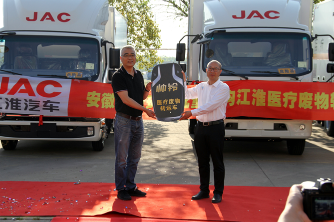 面对疫情防控的紧迫需要,江淮轻卡联动江淮专用车公司快速行动,在10天便完成了相关生产和改装,实现完美交付。随后,江淮轻型商用车营销公司总经理助理陈哲冰为安徽浩悦环境科技有限责任公司副总经理高巍交付了金钥匙。此次批量交车,对常态化疫情防控和医疗废物转运行业具有重要意义。