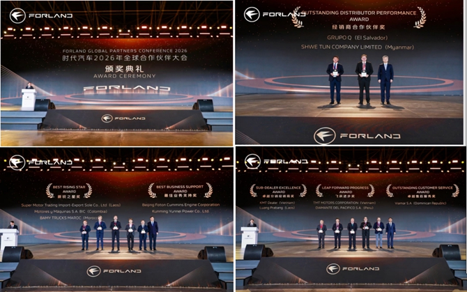 大会同步举行了全球合作伙伴颁奖典礼,由福田汽车职能副总裁、时代汽车党委副书记戴松高主持,为来自越南、老挝、秘鲁、摩洛哥等国家和地区的12家年度突出合作伙伴颁奖,现场掌声持续不断,进一步凝聚了全球合作伙伴的合作信心。