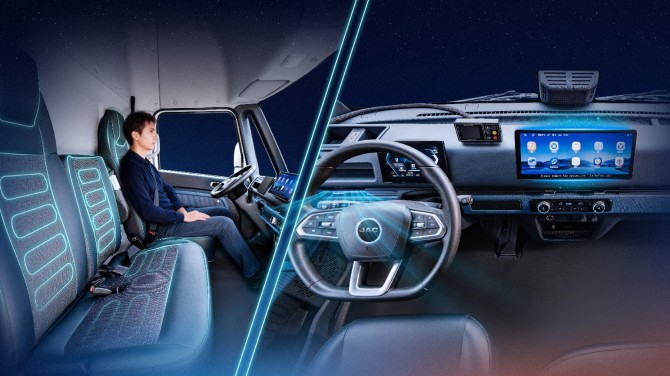 “马年活儿多,跑一天身体不遭罪才能多挣钱。”做快递配送的张师傅,最看重舒适度。坤鹏ET9拥有2170mm行业最宽驾驶室,内高1850mm,他一米八的个头也能在车里站直身体。纯平地板配上气囊减震座椅,开一天车腰也不累。