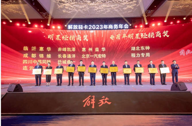 与会领导为获奖代表颁发了“功勋经销商奖”“明星经销商奖”“专用车明星经销商奖”“优秀经销商奖”“新能源销量贡献奖”“新能源市场开拓奖”“区域营销贡献奖”“分销商销售贡献奖”“功勋服务商奖”“备品保障奖”“备品营销奖”“大客户开发奖”“大客户服务保障奖”“专用车销售贡献奖”“专用车重点产品推广奖”“冷链市场开拓奖”“领途销售贡献奖”“金牌讲师奖”,并向上述获奖单位及个人表示祝贺。