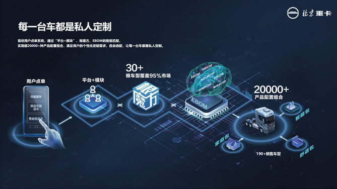 北京重卡基于“平台化+模块化”的设计模式、“根魔方”技术和超级BOM的点单交付系统,精准定义和研发,可实现超20000+种产品配置的自由组合,覆盖95%的市场,并让客户全程参与重卡的定制生产和交付,开启国内定制化重卡先河。