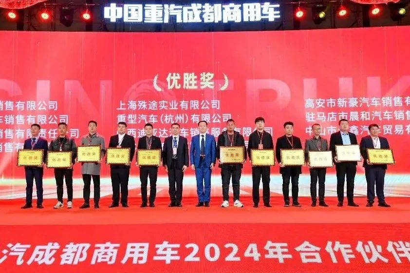 大会现场,重汽成商对2023年度优秀合作伙伴进行了颁奖授牌,隆重表彰了在发展路上一直与重汽成商同心同行的合作伙伴。