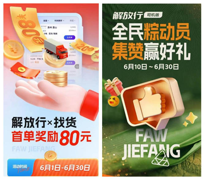 2、同城货源:新司机首单奖励50元-80元;非首单奖励20元/单;同城货源/活动期间,每位司机单日奖励限3单,本次活动仅限一汽解放车辆,具体补贴金额以找货列表页面活动标签为准。