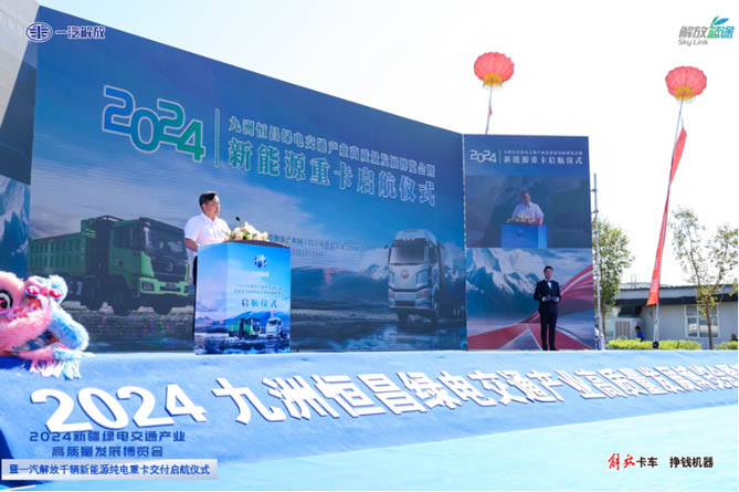 2024新疆绿电交通产业高质量发展博览会暨一汽解放千辆新能源纯电车辆启航仪式于7月27-28日在新疆昌吉市九州恒昌物流集团园区举行。作为中国商用车行业的领军企业,一汽解放新能源事业部携行业主要应用场景产品亮相此次展会,向观众展示了一汽解放的最新成果和技术实力,再一次以高端、高效、节能的新突破为新疆当地物流运输高质量发展注入新动能。一汽解放公司党委委员、副总经理季一志先生;自治区交通厅一级巡视员王永轩;自治区工商联党组成员、副主席斯日古楞;昌吉州人民政府副州长李丹;九洲恒昌股份有限公司董事长王云章先生等嘉宾出席了本次活动。