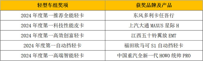 轻型车组获奖品牌及产品