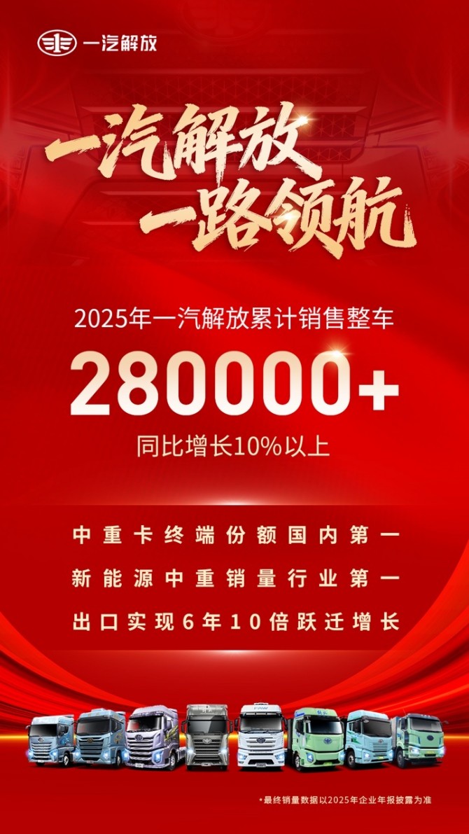 2025年,是挑战与机遇交织的一年,更是一汽解放自我超越、引领行业的一年。从制胜终端到新能源领跑,从智造工厂落成到全球生态链拓展,一汽解放每一份出彩都凝聚着全体解放人的坚守与奋斗。站在2026年新的起点,一汽解放将继续以“自主自强”的初心砥砺前行,建设“科技解放、绿色解放、国际解放”,推动企业实现跨越式新发展,奋力打赢“十五五”开局战!