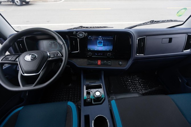 虎6G内饰以“高端、智能、舒适”为核心,采用蓝色系配色,12项内饰升级配置。包括:豪华贯通式“轿车”仪表板,动静分离;标配8寸液晶仪表+10寸液晶大屏,让轻卡也拥有轿车的“双联屏”;同时,标配旋钮换挡+EPB/一键启动便捷高效,镀铬+仿木纹饰板高端点缀,冷暖箱+不锈钢踏板实用升级等,打造新能源专属舒适座舱。