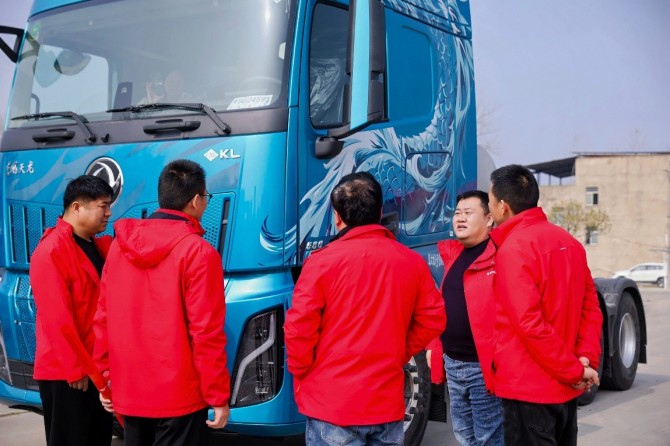 试驾开始前,现场有序排列的4款东风天龙新KL持续吸引着卡友们驻足交流。“我们跑京津冀专线,车是工具,也是门面。来自河北的张师傅表示, “这台车造型更有力量感,龙纹与车身融为一体,开出去有面子。”来自广东的吴师傅补充道:“对,有中国龙的气韵,看着提气,跑长途也寓意顺利。”